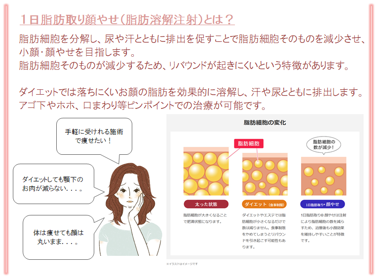 脂肪細胞の数を減少させることで、脂肪による顔のもたつきを改善します。※モニター価格は9ccまで