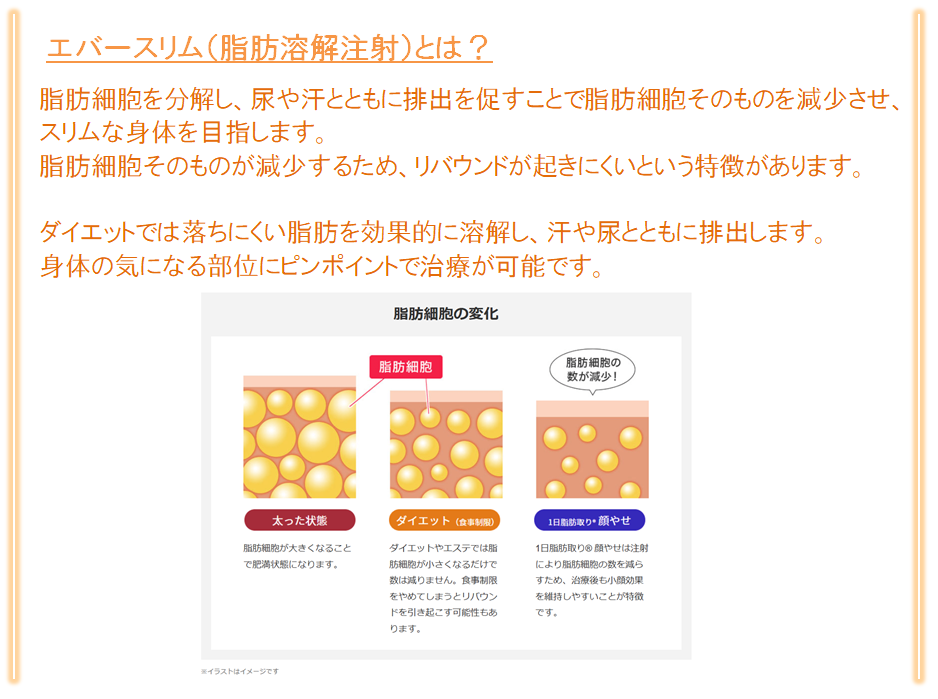 脂肪溶解注射を身体の気になる箇所に注入し、脂肪細胞を減らすことでスリムな体型を目指す施術です。※モニター価格は9ccまで
