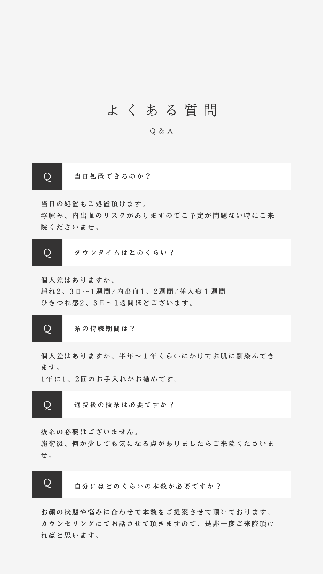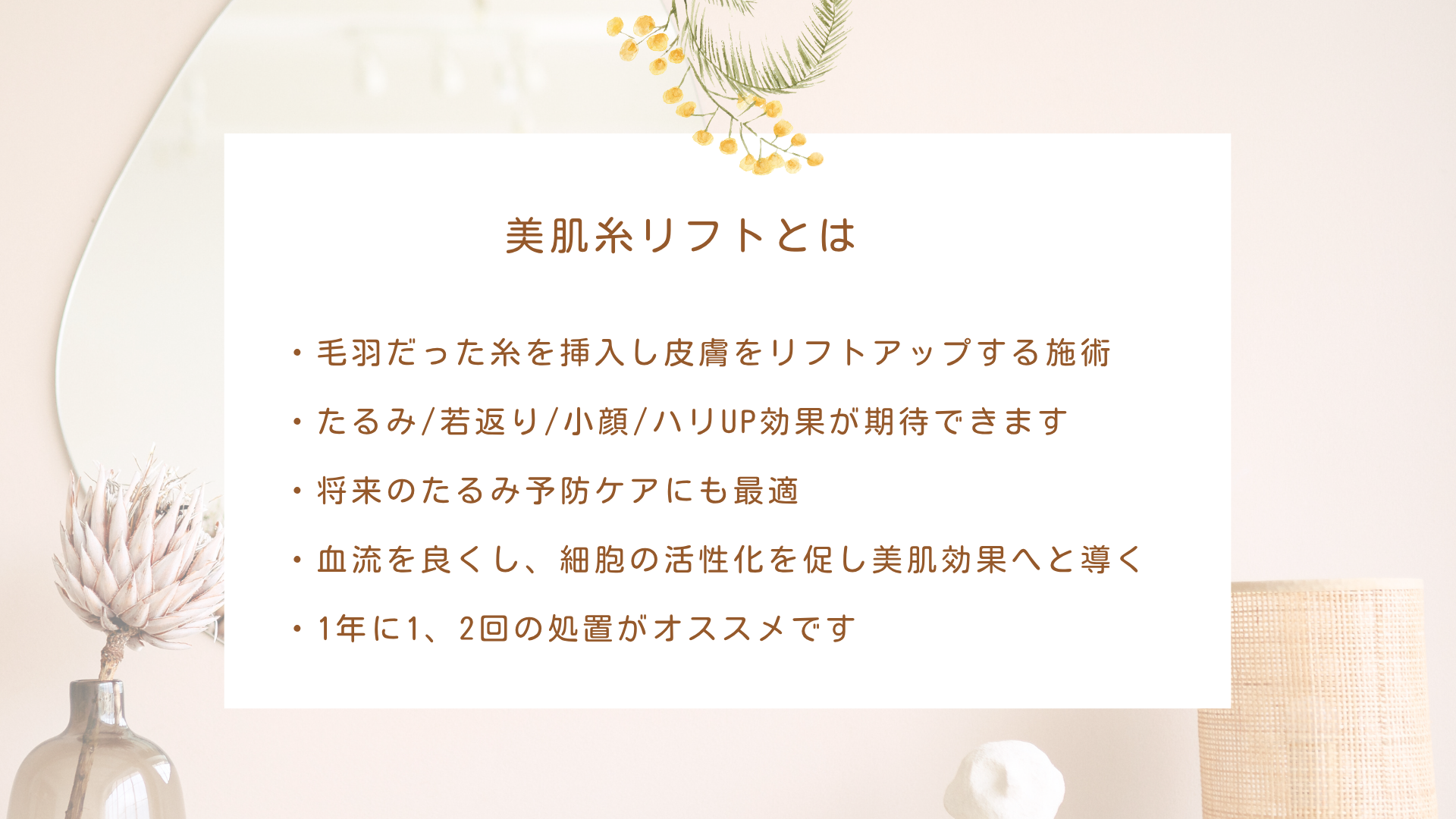 脂肪をとってから毛羽立った糸を挿入する小顔治療。お肌を引き上げたるみを改善し肌細胞を活性化する作用でハリや艶のある若々しいお顔へと導きます。