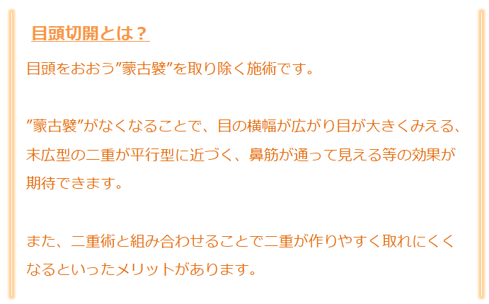 目頭を覆う「蒙古襞」を切開して目を内側に大きくする施術です。目の左右差を揃えたい方にもおすすめです。