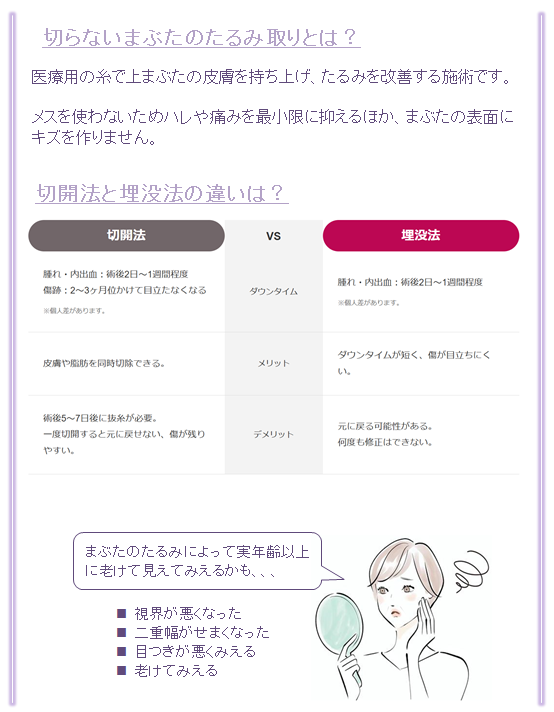 上まぶたの皮膚のたるみを持ち上げ、たるみ改善する施術。