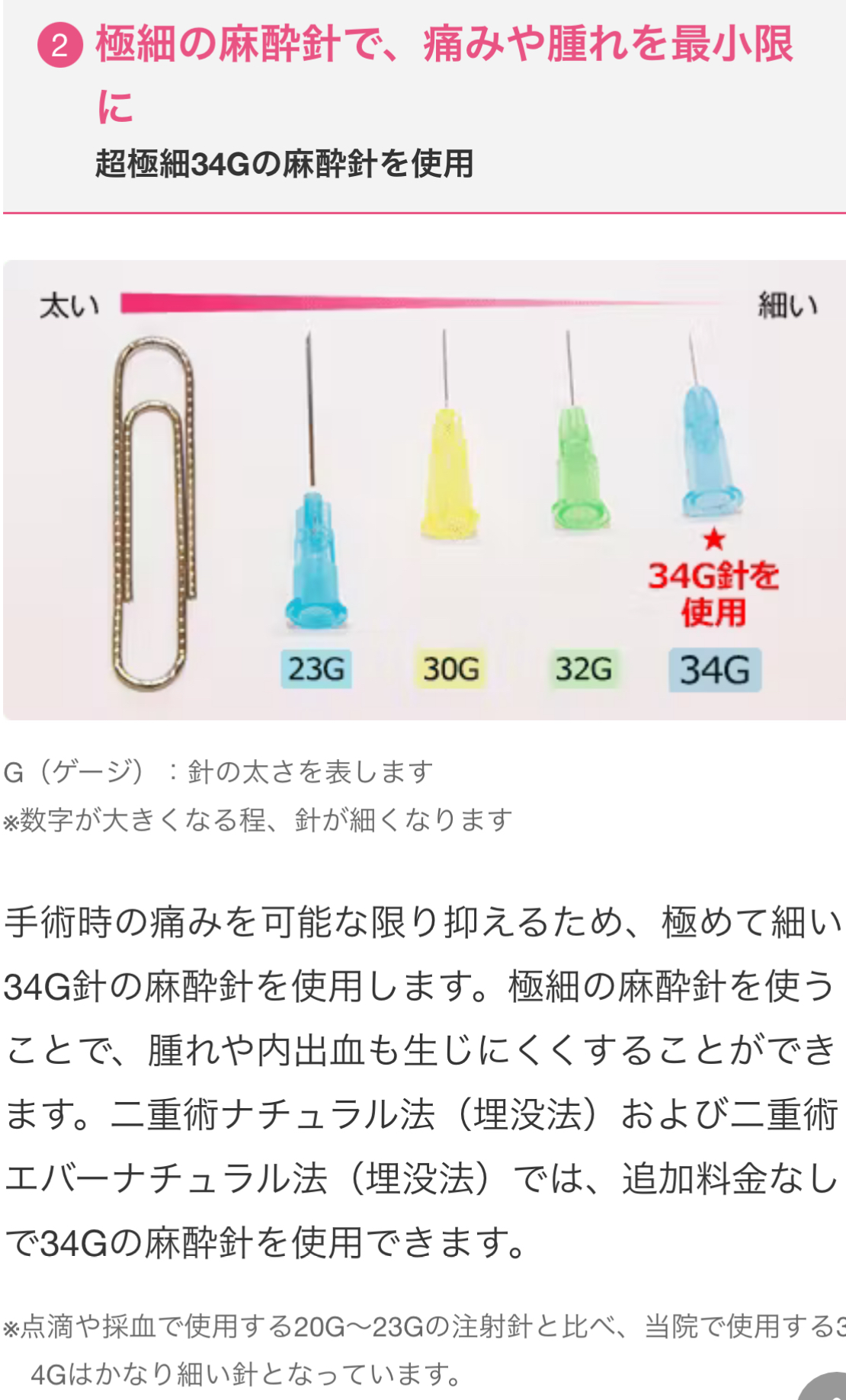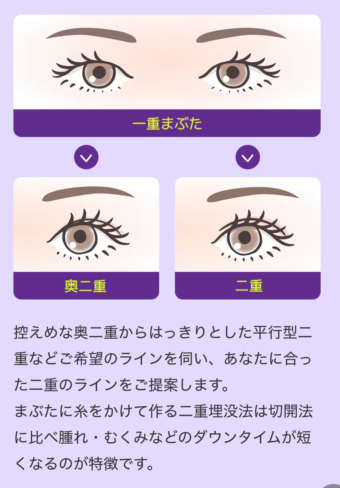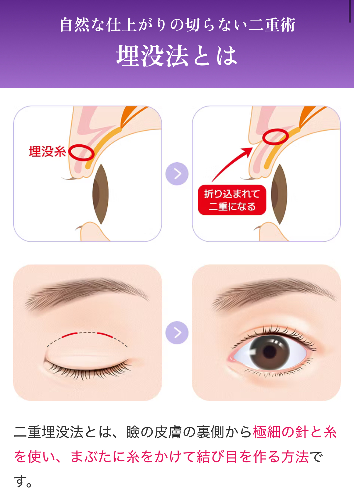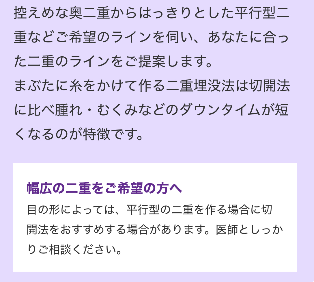 埋没法は繰り返し行うと、目の上がボコボコしてしまうケースがありますので、当クリニックでは1回施術で二重をしっかりキープできる方法をお選びいただくことをおススメしています。