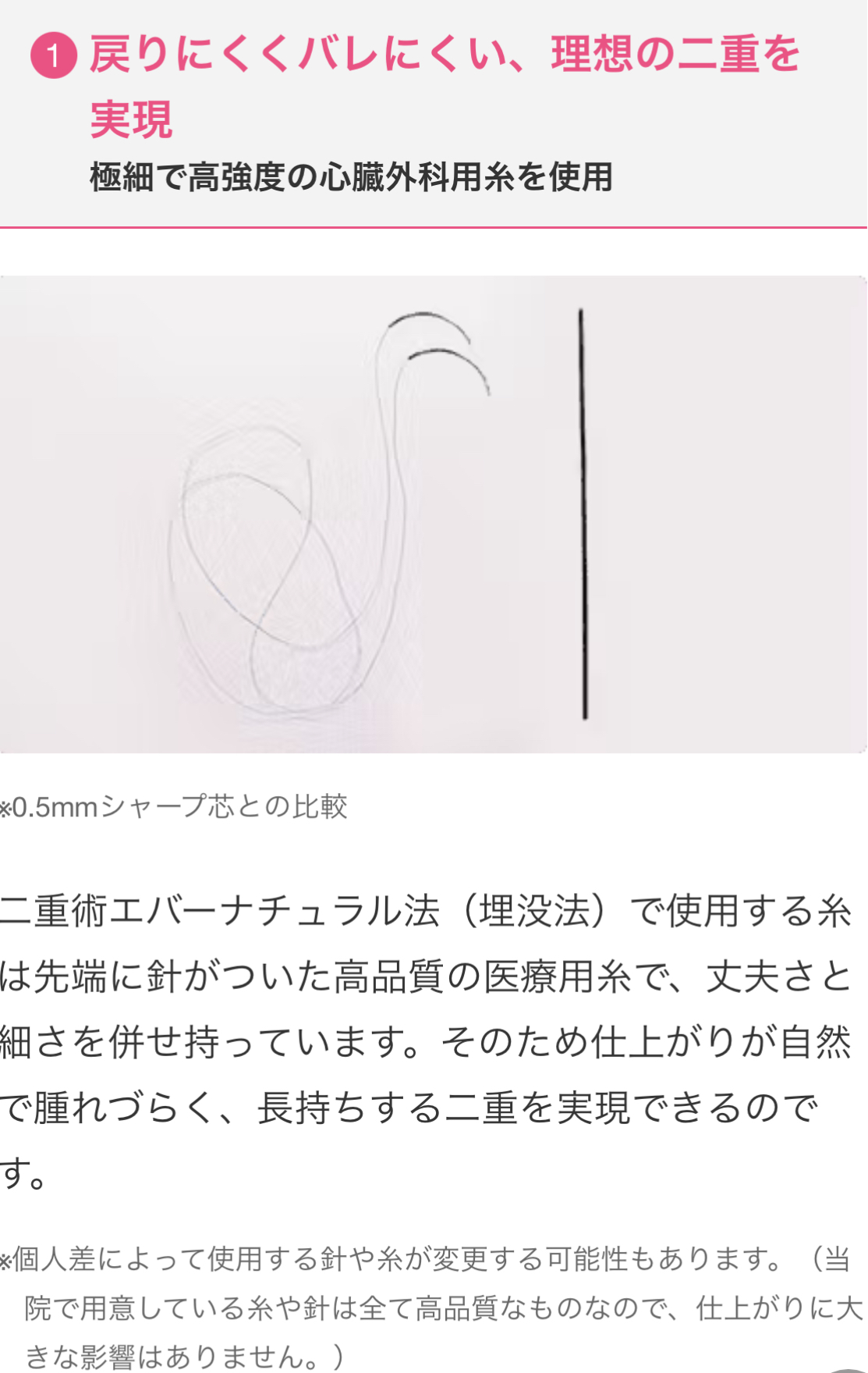 極細で高強度な医療用糸を使用するのでとても自然な二重に仕上げることが可能になります。人によってまぶたの厚さや硬さ、目の形などが異なりますが、二重術エバー ナチュラル法は、一人一人に合わせた二重ラインを再現することが出来ます。