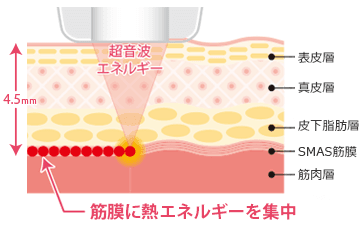 お伝えしたように、HIFUは超音波を一点に集中させる治療法ですが、その熱エネルギーは、「SMAS(スマス)筋膜」にまで到達します。筋膜とは、筋肉を覆っている薄い膜のことで、とくに顔などの筋膜は「SMAS(表在性筋膜群)」と呼ばれます。加齢などで顔の筋力が低下すると、それを覆うSMAS筋膜も緩んだ状態になります。この緩んだSMAS筋膜にアプローチできるのが、HIFUです。