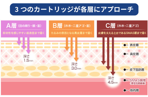 ハイフは超音波エネルギーを使い、従来のレーザーでは施術が難しかったSMAS(スマス)層を刺激する施術です。皮膚は表皮、真皮、皮下脂肪の三層で形成されています。SMAS筋膜は、皮下脂肪の下に位置する組織です。