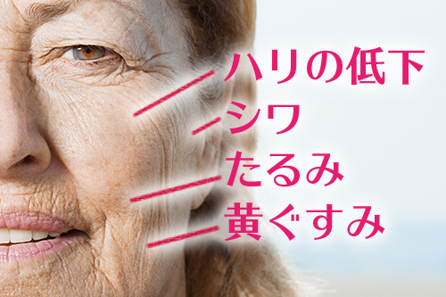 「糖化」という言葉をご存知ですか?糖化とは体内の余分な糖とタンパク質が結びつくことによって「AGEs(Advanced Glycation End Products=エイジズ=終末糖化産物)」が蓄積され老化につながるというもの。コラーゲンはこの糖化の影響を受けやすいタンパク質です。糖化によってコラーゲンの特性である柔軟性が失われると、肌のハリの減少やシワ、たるみを招いてしまいます。また、真皮層のコラーゲンが糖化によって黄褐色に変色してしまうことで肌の黄ぐすみを引き起こします。年齢を重ねていくと肌がなんだか硬くなる、黄ぐすみが気になる、などの悩みが生じるのも、実は糖化のせいなのです。