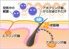 アポクリン汗腺は主に腋の下やバスト・陰部などに分布し、分泌された汗には中性脂肪・脂肪酸・コレステロールといった脂質や鉄・色素・細胞破壊成分が含まれており、この汗が皮膚の表面や毛穴に生息する細菌による分解を受け、独特の臭いとなります。