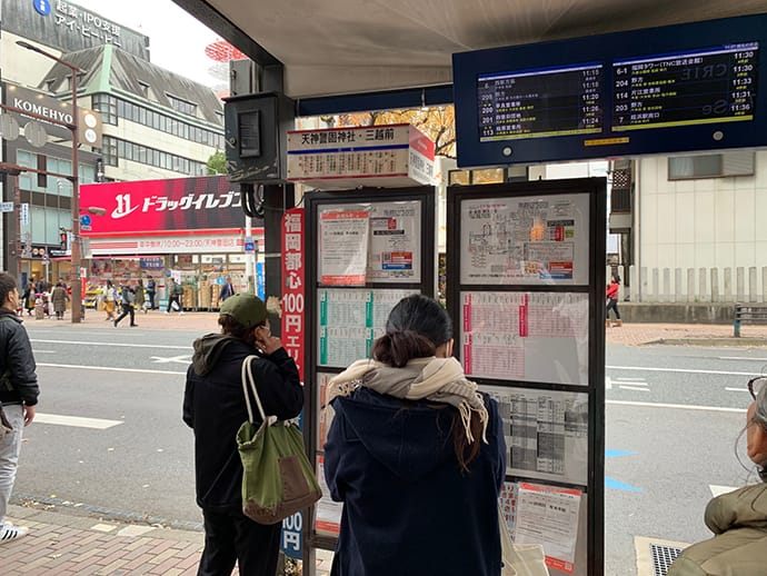 最寄りのバス停「天神警固神社・三越前」で下車します。