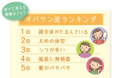 2位は「太めの体型」で、モデル体型とまでは行かなくても、標準的な体型の方が若く見えるようです。4位に「服装に無頓着」、5位には少し意外かも?「髪がパサパサ」が入りました。