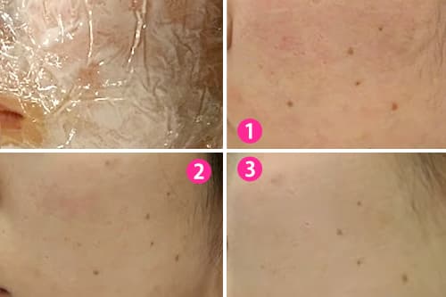 ③は4日後。クレンジングや洗顔の時に小さな円形のかさぶたがポロポロと取れ始め、肌のざらつきが軽減され的ます。