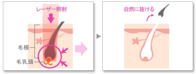 毛にはメラニンが含まれているので、レーザーを照射するとその光熱作用が毛から毛包に伝わり、毛包外側にある毛を作る細胞、follicular stem cellを熱変性させます。これにより永久脱毛が可能となります。熱を完全にfollicular stem cellに伝えるためには照射時間を長くしなければならないので、表皮に影響を与えないように皮膚表面を冷却しながら照射します。