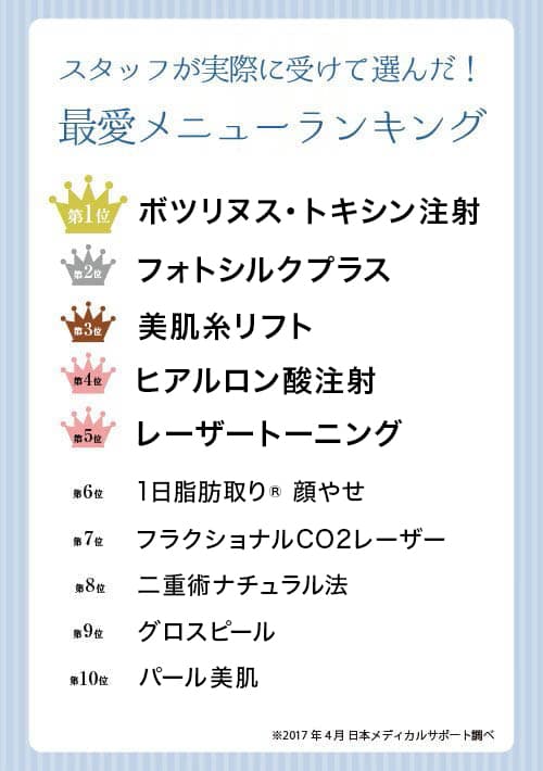2017年、品川美容外科及び品川スキンクリニックのスタッフに「実際に受けて、よかった!と思うメニュー」のアンケートを行いました!美容医療に詳しいスタッフたちが実際に受けて良さを実感したメニューはどれだったのでしょうか?