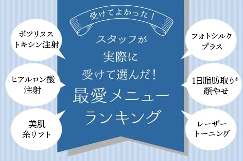 今回は、彼女たちがこれまでに実際に受けて「よかった!」「リピートしてる!」「友人にもすすめたい!」と感じた施術だけを調査してランキングにまとめました!手軽に受けられ、かつ効果が期待できるスタッフ人気の高い施術はきっと参考になるはずです♪