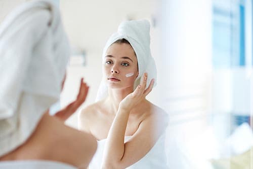 汚れを落としたらすぐに、肌の角質層に水分と油分を補いましょう。化粧水だけでも潤ったような気がするかもしれませんが、そこで安心してしまうのはNGです。化粧水が蒸発するときに肌の中の水分まで奪われますので、油分を一緒に補うプロセスは必須です。とくに皮膚の薄い頬や目の下などは、二度に分けて保湿をしもよいでしょう。こめかみのあたりや耳まわりまで、手で温めるようにしてまんべんなく塗ります。