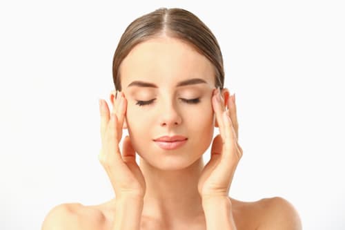 (4)同じ動きをおでこからこめかみに向かって行い、最後に4本指をそろえて左右のこめかみを軽くおします。