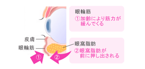 このほか、眼輪隔膜や眼窩脂肪の下にある靭帯が緩むことや、加齢とともに骨格自体が変形してしまうことも、要因の一つと考えられています。