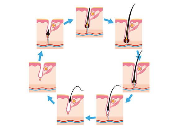 DHTは、髪が生え変わる毛周期のサイクルを短くすると考えられています。通常の毛周期は、平均すると約4年間続きますが、DHTの産生が増加すると成長期が短くなり、数ヶ月〜1年という短い期間で、毛周期が回ってしまいます。すると、太くてコシのある健康的な髪が育たず、細くて短い軟毛ばかりが見られるようになり薄毛が進行してしまうのです。