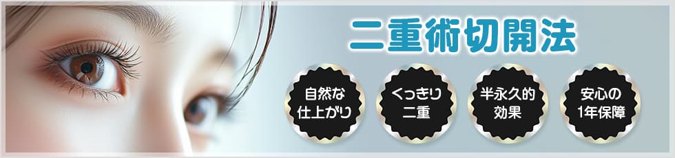 切開法は、二重のラインに沿って目頭から目尻側まで切開する「全切開法」と二重のラインのうち数ミリを切開する「小切開法(部分切開法)」の2種類あります。まぶたの状態や二重のイメージに合わせて、切開方法が選べるので、より理想的な目元に近づくことができます。