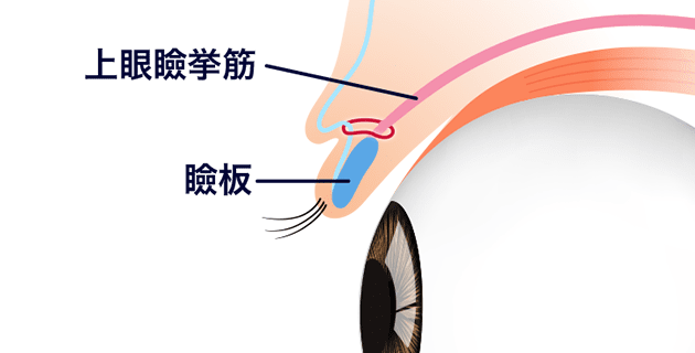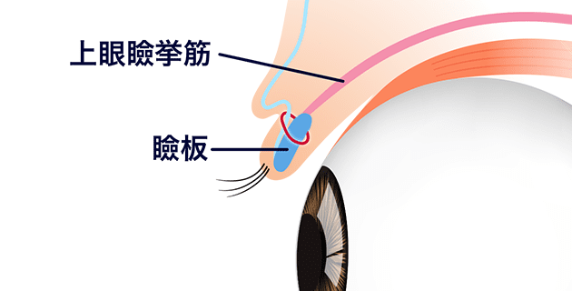 まぶたを持ち上げる筋肉を「上眼瞼挙筋(じょうがんけんきょきん)」と呼び、まぶたの皮膚の下にある軟骨を「瞼板(けんばん)」と言います。まぶたを開けたり閉じたりする動きは、眼輪筋(がんりきん)の奥にある眼瞼挙筋というまぶたの筋肉の収縮によって瞼板が持ち上がったり下げたりすることで行われます。