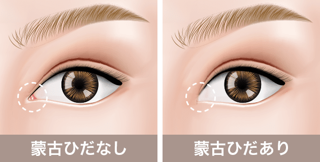蒙古ひだとは、上まぶたの内側から目頭にかけて覆われている皮膚のことです。目頭には「涙丘(るいきゅう)」と呼ばれるピンク色の部分があり、この部分を覆っていると蒙古ひだがある状態になります。蒙古ひだが発達していると、目が小さく見えたり、平行二重にはなりにくい傾向にあります。