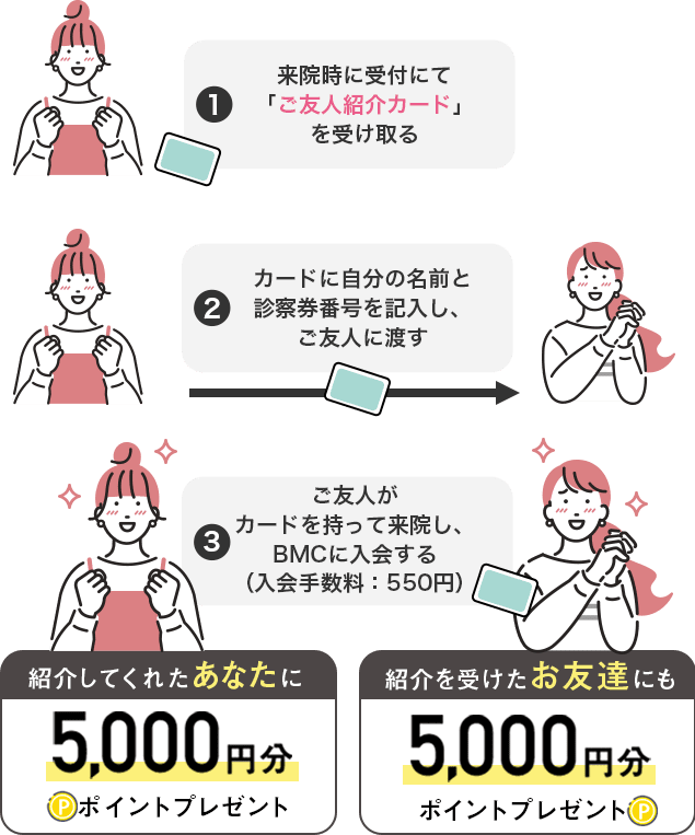 複数の方に紹介すれば、その人数分×5,000ポイントが付与されます。 - Q 紹介した友人に施術内容は知らされますか?