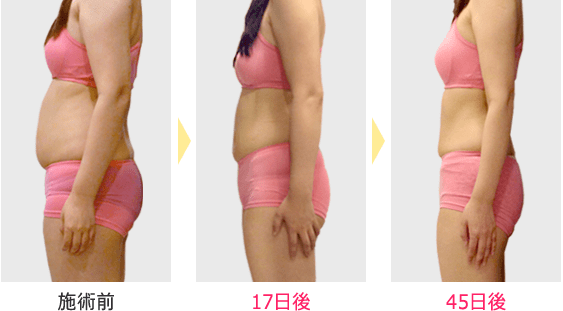 - A 従来の脂肪吸引では、ダウンタイムに長い期間を要し、脂肪溶解注射(融解剤を用いた注射)では、効果が現れるのに3~4週間要していましたが、エバー・スリム®の皮下脂肪への注射では最短で翌日にボディラインの変化を実感いただけます。