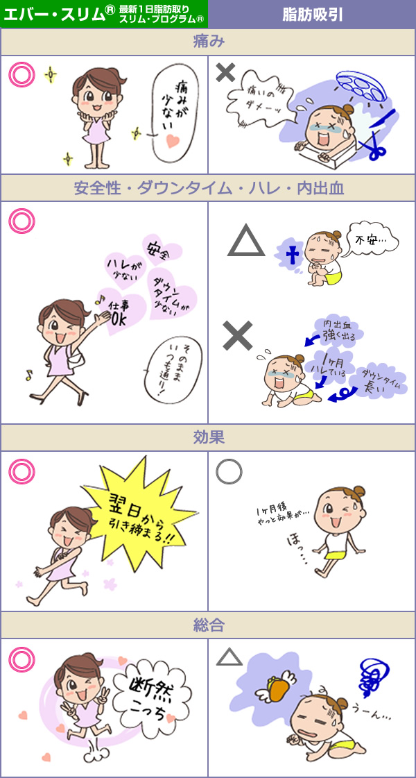 脂肪吸引では、脂肪細胞を外科的に取り除くため、毛細血管などの皮下組織の損傷は免れませんでした。内出血や塞栓、場合によっては麻酔による副作用の危険もあります。 しかし、エバー・スリムは注射で、天然ハーブ由来成分により脂肪の分解を促す方法なので大変安全です。また気になる箇所だけ部分痩せが可能です。