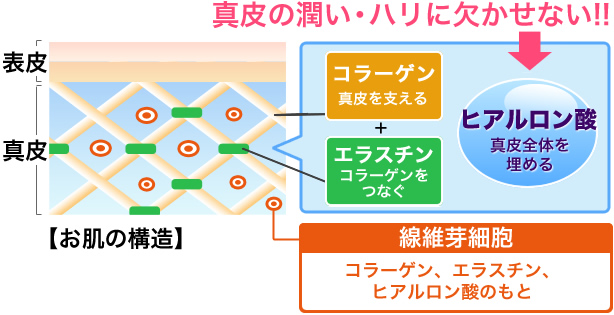 皮膚にある柔軟性や弾力性を支える「保湿・保水成分」です。もちろん人体に無害でアレルギーもありません。真皮の3要素と呼ばれる「コラーゲン」、「エラスチン」と共に、潤いとハリをもたらす
