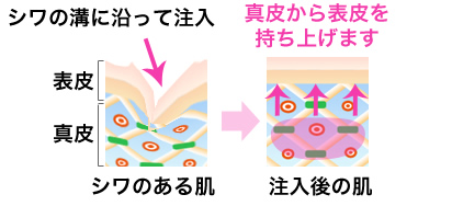 注入したヒアルロン酸が真皮の内側から肌を持ち上げて、シワの溝を改善します。注入した箇所はお肌がふっくらとボリュームアップし、見た目の変化をその場で実感できます。