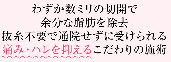 お客様が施術を受けられるにあたり、躊躇される要因が「痛み・ハレ」への不安です。 品川美容外科では、極細の注射針で挿入時の痛みやハレを最小限に抑えたり、施術時間の短いメニューを開発するなど取り組んでいます。また、痛みを少なく、快適に施術を受けていただくために麻酔もございます。 お客様の術中の痛みの軽減をしっかりとコントロールいたします。