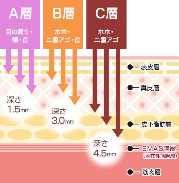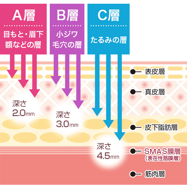 皮フには浅い層(表皮層、真皮層、皮下脂肪層)と深い層(SMAS層、筋肉層)があります。