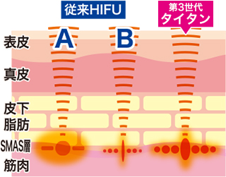 HIFUエネルギーはシワの原因となる浅い層から、たるみの原因となる深い層まで照射が可能です。そのため、お一人おひとりの症状に合わせて効果的に治療を行うことができます。