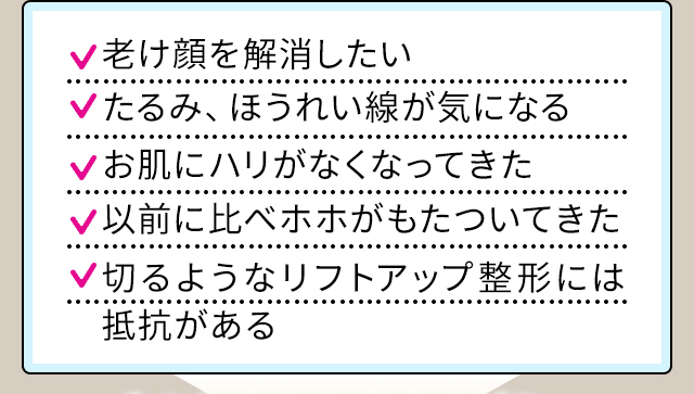 その上で、いろんな施術の中から、仕上がりの具合、ダウンタイムの程度などを考慮し、一番ベストなメニューをご提案いたします。