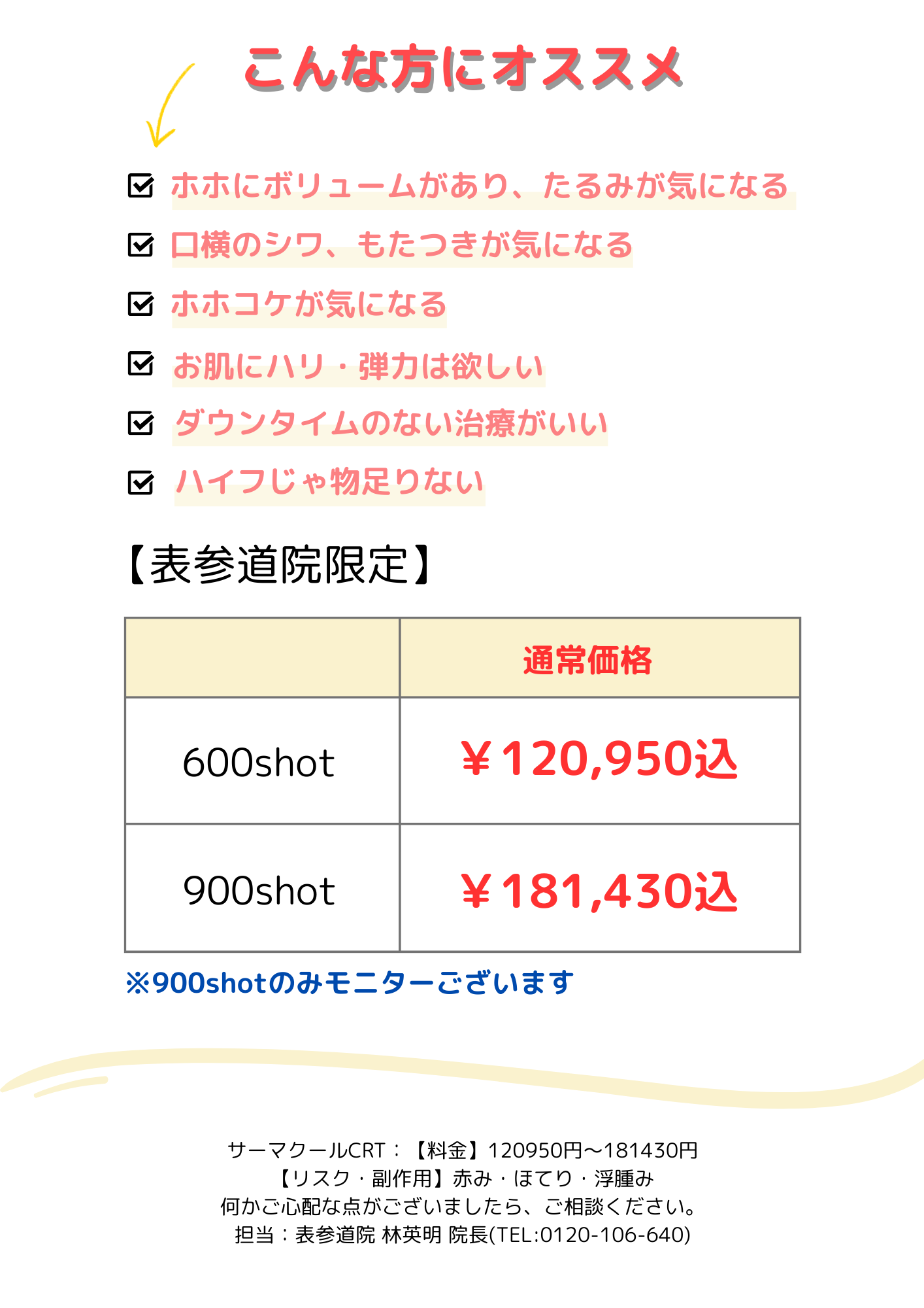【表参道院限定・院長林】サーマクールCPT 600・900shot たるみ改善、お肌にハリが欲しい方に