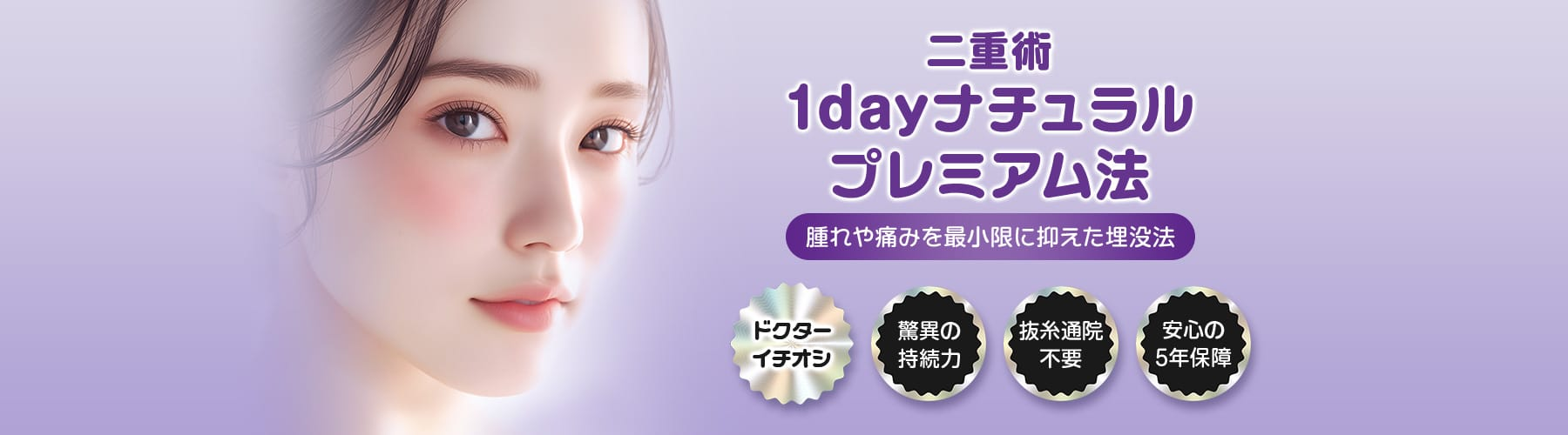 二重術1dayナチュラルプレミアム法(埋没法)は、切開なしで自然な二重をつくる二重術埋没法です。心臓外科でも使われる丈夫で極細の糸を使用することで、痛み・腫れを極力抑えます。手術中や術後の負担が少なく、元に戻りにくいのが特徴です。