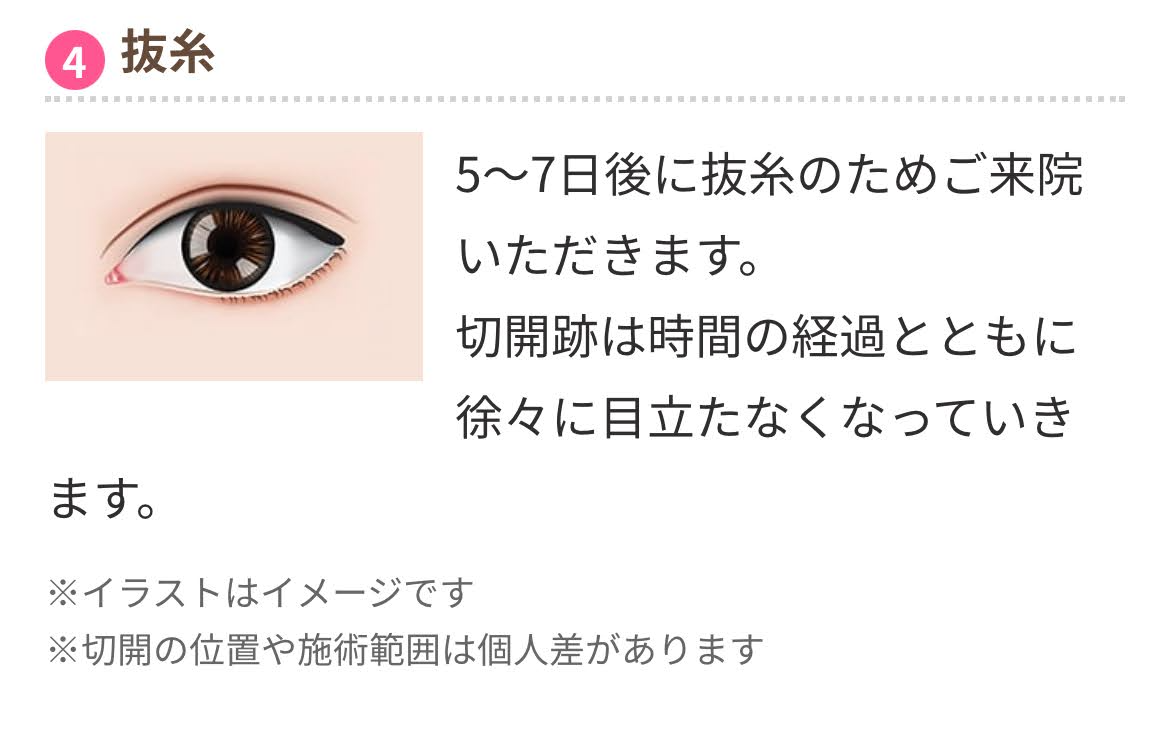【副作用・リスク】腫れ/痛み:2日~1週間位。内出血:1~2週間位。通院:5~7日後に抜糸の為来院。傷跡:1ヶ月位。