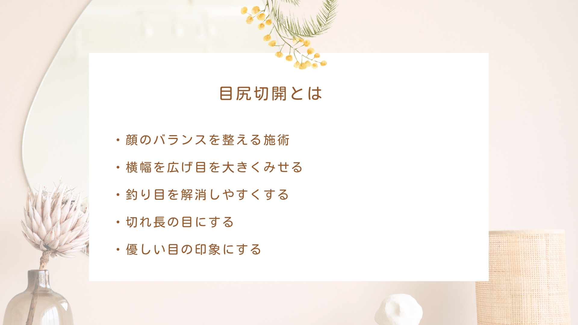 スーパーナチュラル目尻切開法は、目尻を切開することにより、切れ長の大きい目にすることで顔全体のバランスを整えます。