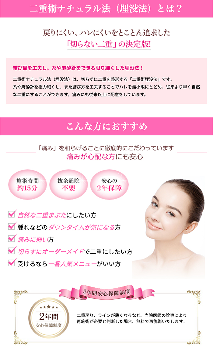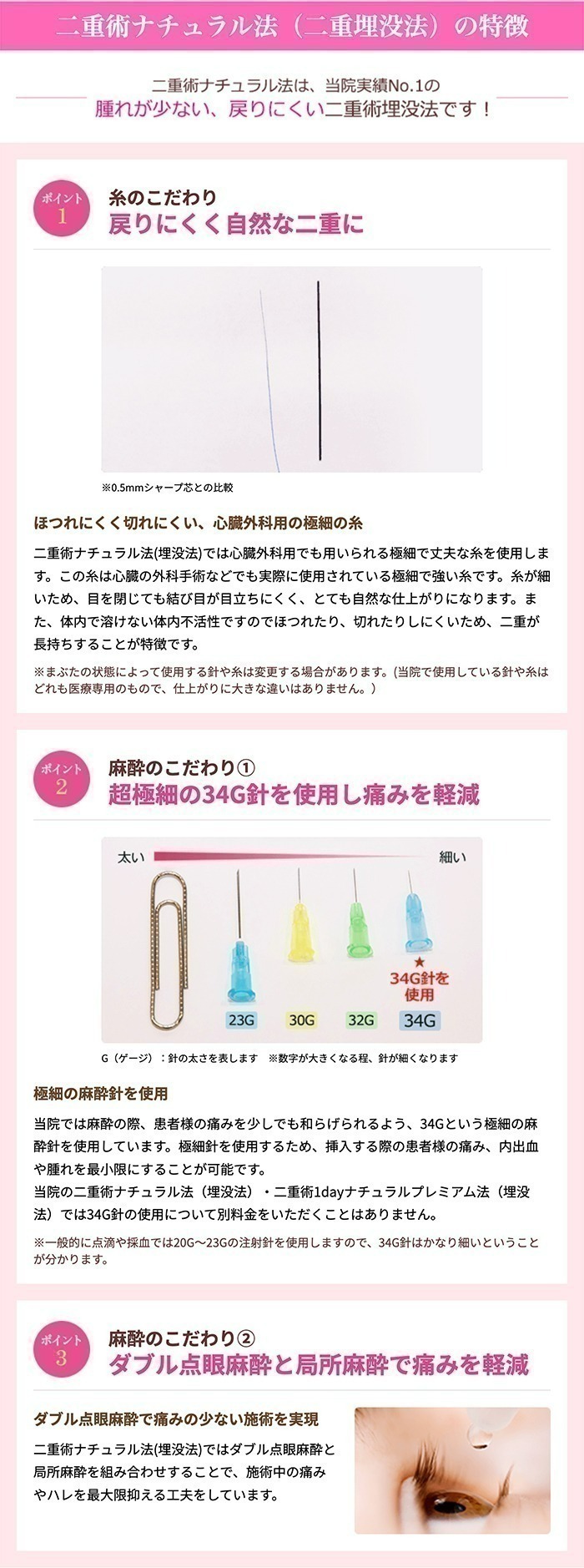 結び目を工夫し、糸や麻酔針をできる限り細くした埋没法! 二重術ナチュラル法(埋没法)は、切らずに二重を整形する「二重術埋没法」です。 糸や麻酔針を極力細くし、また結び方を工夫することでハレを最小限にとどめ、従来より早く自然な二重にすることができます。