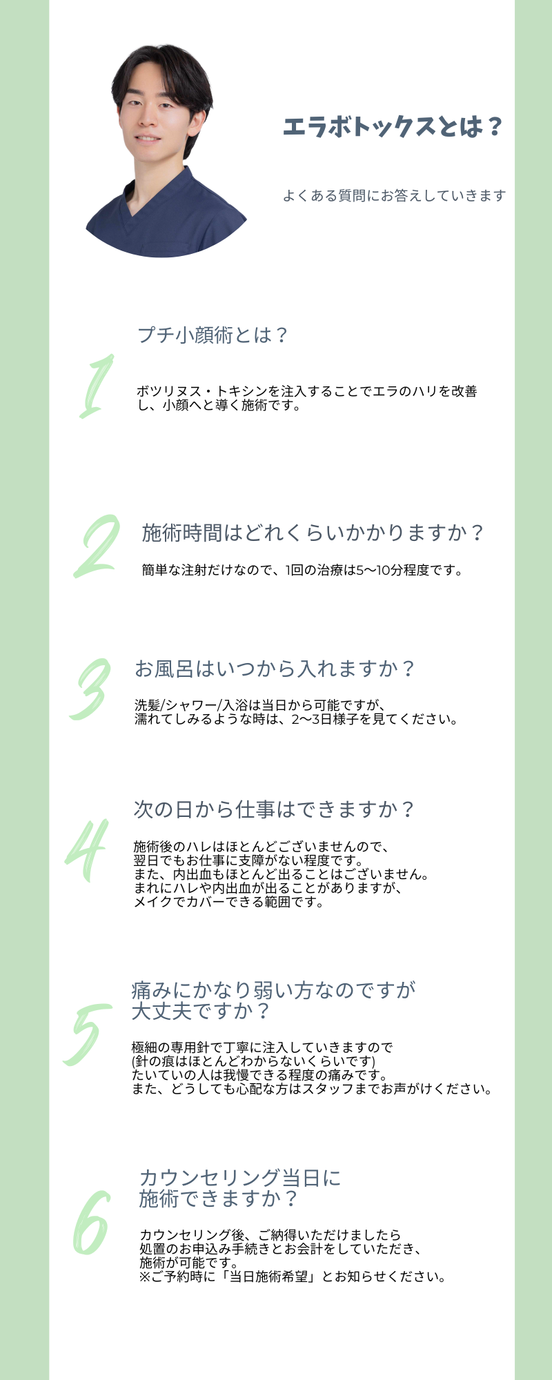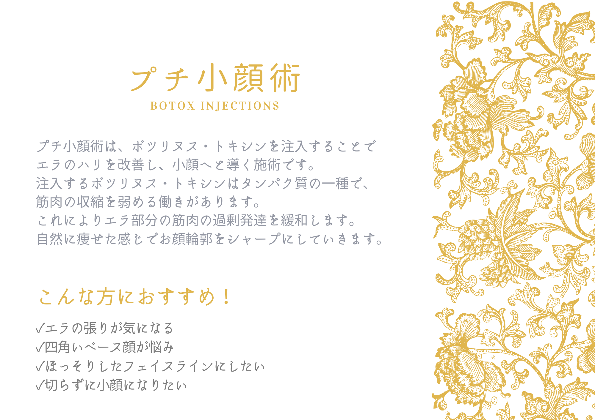 ボツリヌス・トキシンを注入することでエラのハリを改善し、小顔へと導く施術です。