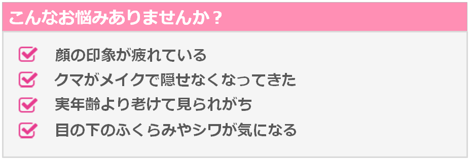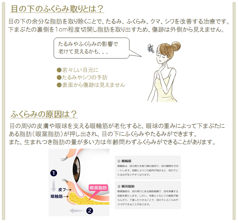下まぶたの眼科脂肪を取り除くことによってふくらみ(クマ)を改善します。※表示は両目ライトタイプの価格