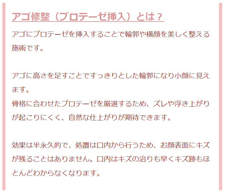アゴの部分にプロテーゼを挿入することで輪郭や横顔を美しく整える施術です。