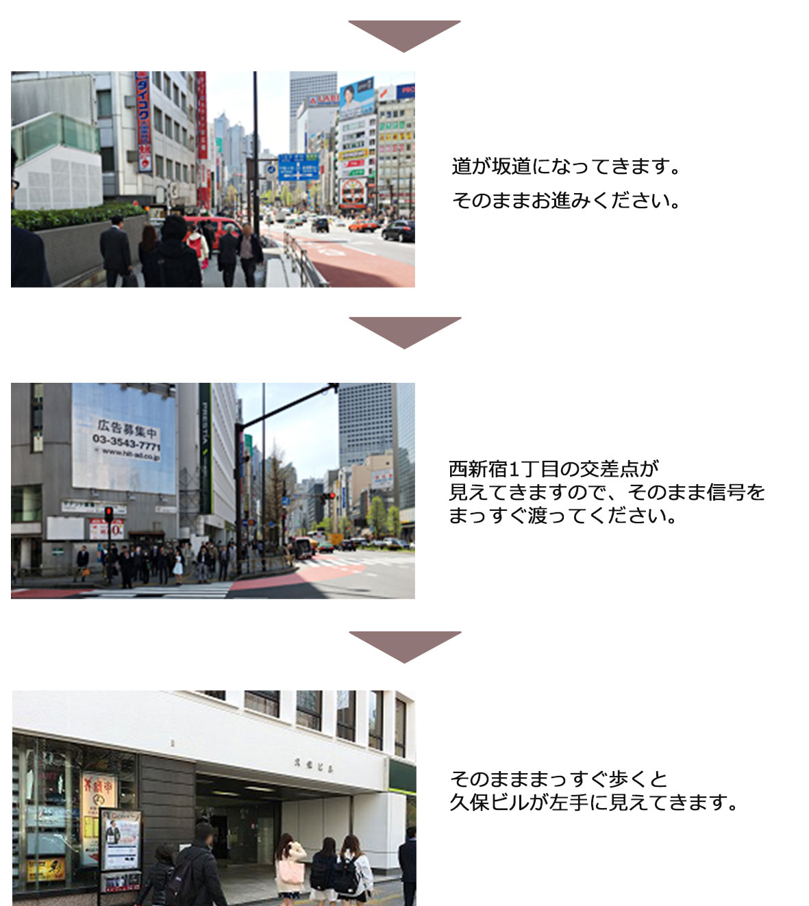 - JR新宿駅南口より徒歩約3分。南口の改札を出たら、正面の甲州街道の信号を渡り、駅を背に右方向へ。そのまま道に沿って直進すると、西新宿1丁目の交差点が見えてきますので、信号を渡り、左手の久保ビル6Fです。
