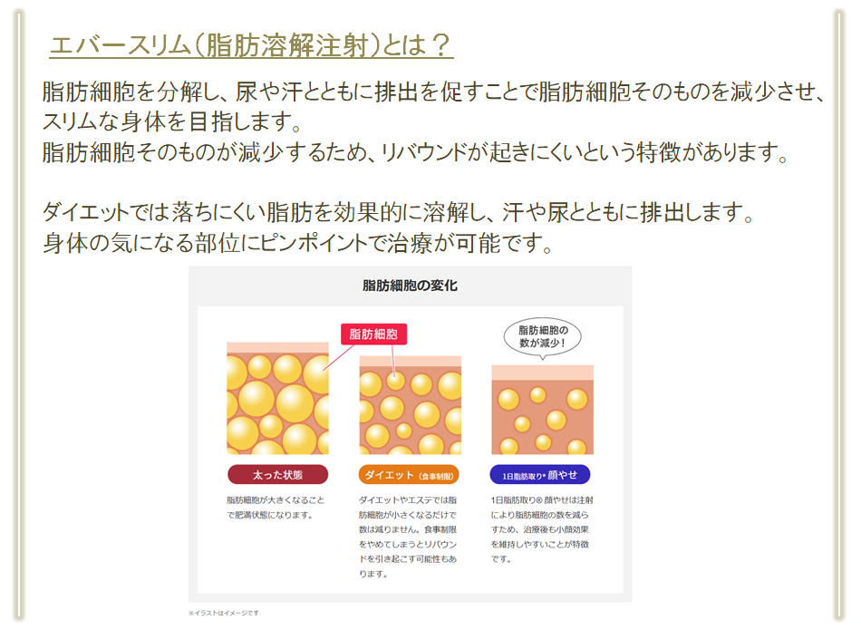 脂肪細胞の数を確実に減らし、リバウンドしにくい身体にする施術です。※モニター価格は9ccまで