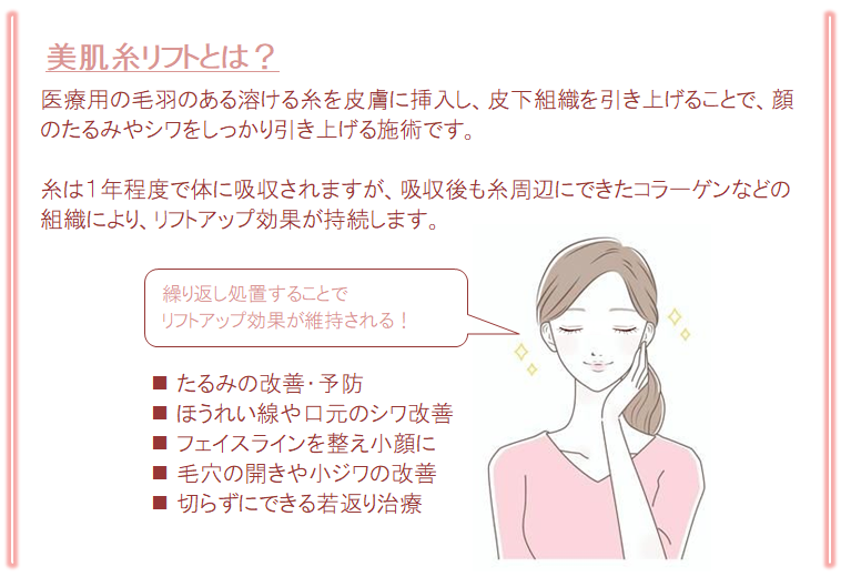 溶ける糸を挿入してたるみを引き上げ肌質を改善する施術です。
