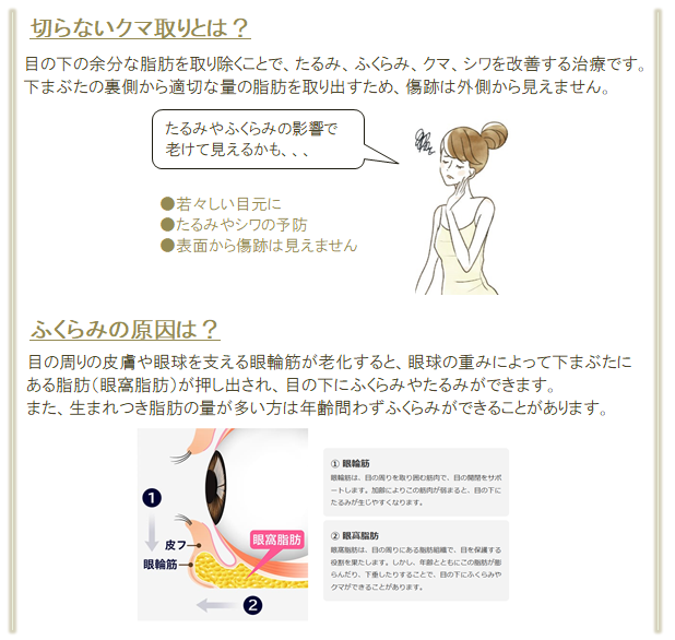 下まぶたの眼科脂肪を取り除くことによってふくらみ(クマ)を改善します。※表示は両目ライトタイプの価格