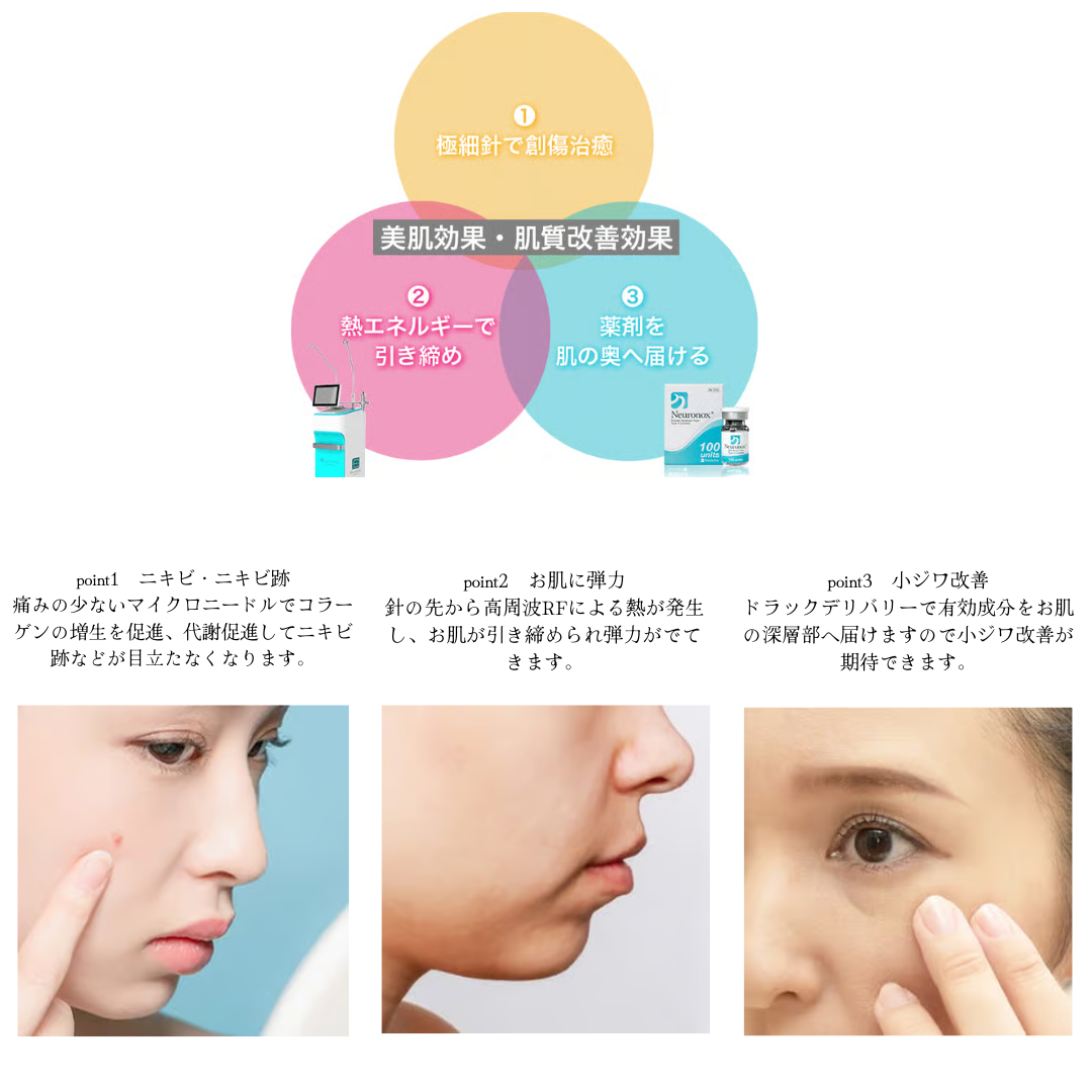 一度の治療で3つの効果が得られ、針治療特有の内出血や赤みなどのダウンタイムも少ない新しい治療