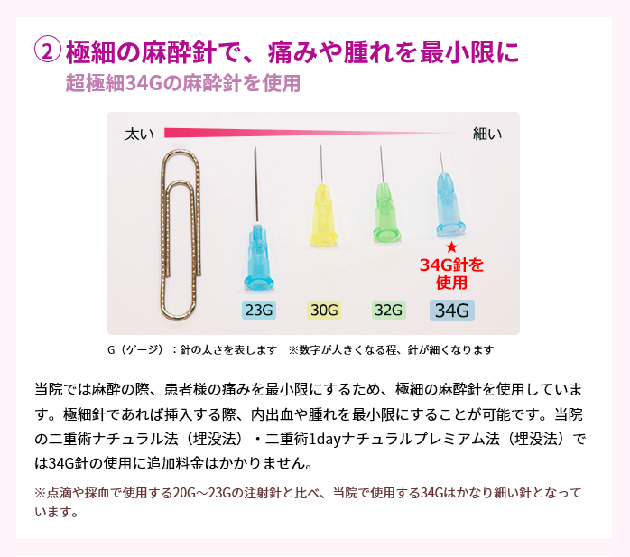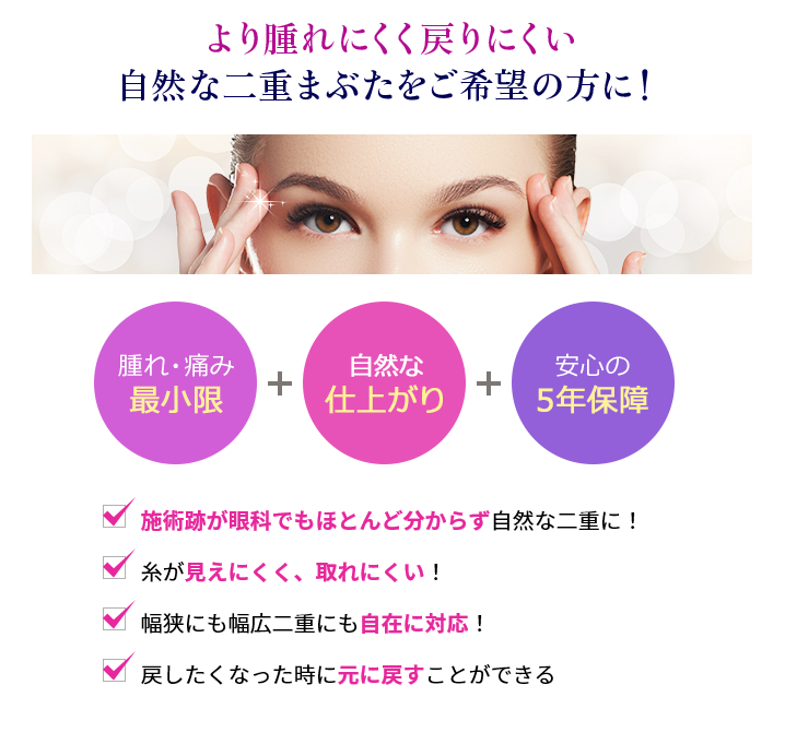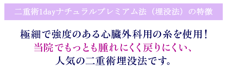 極細で強度のある心臓外科用の糸を使用し、痛みや腫れを最小限に抑えたので患者様の負担も少なく、強度も高い二重術です。