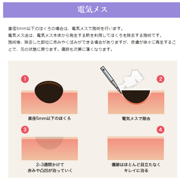 炭酸ガスや電気メスを使用してホクロ、イボを除去します(表示価格は1mmの金額)