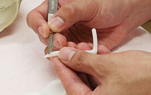 完成した顔型に合わせてドクターがプロテーゼを削り、お客様の希望に合うように、プロテーゼの形を仕上げていきます。