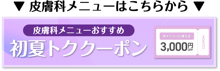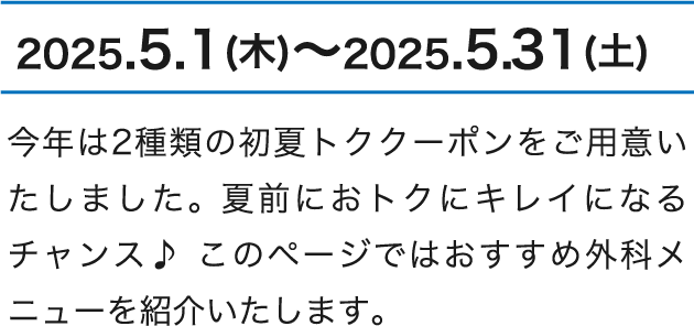 2025.5.1(木)~2025.5.31(土) 今年は2種類の初夏トククーポンをご用意いたしました。 夏前におトクにキレイになるチャンス♪ このページではおすすめ外科メニューを紹介いたします。
